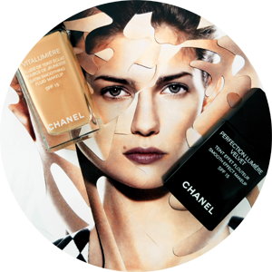 Chanel's Vitalumière Satin Smoothing Fluid Makeup and Chanel's Perfection Lumière Velvet Smooth-effect makeup. In the background: photo by Damien Blottière.