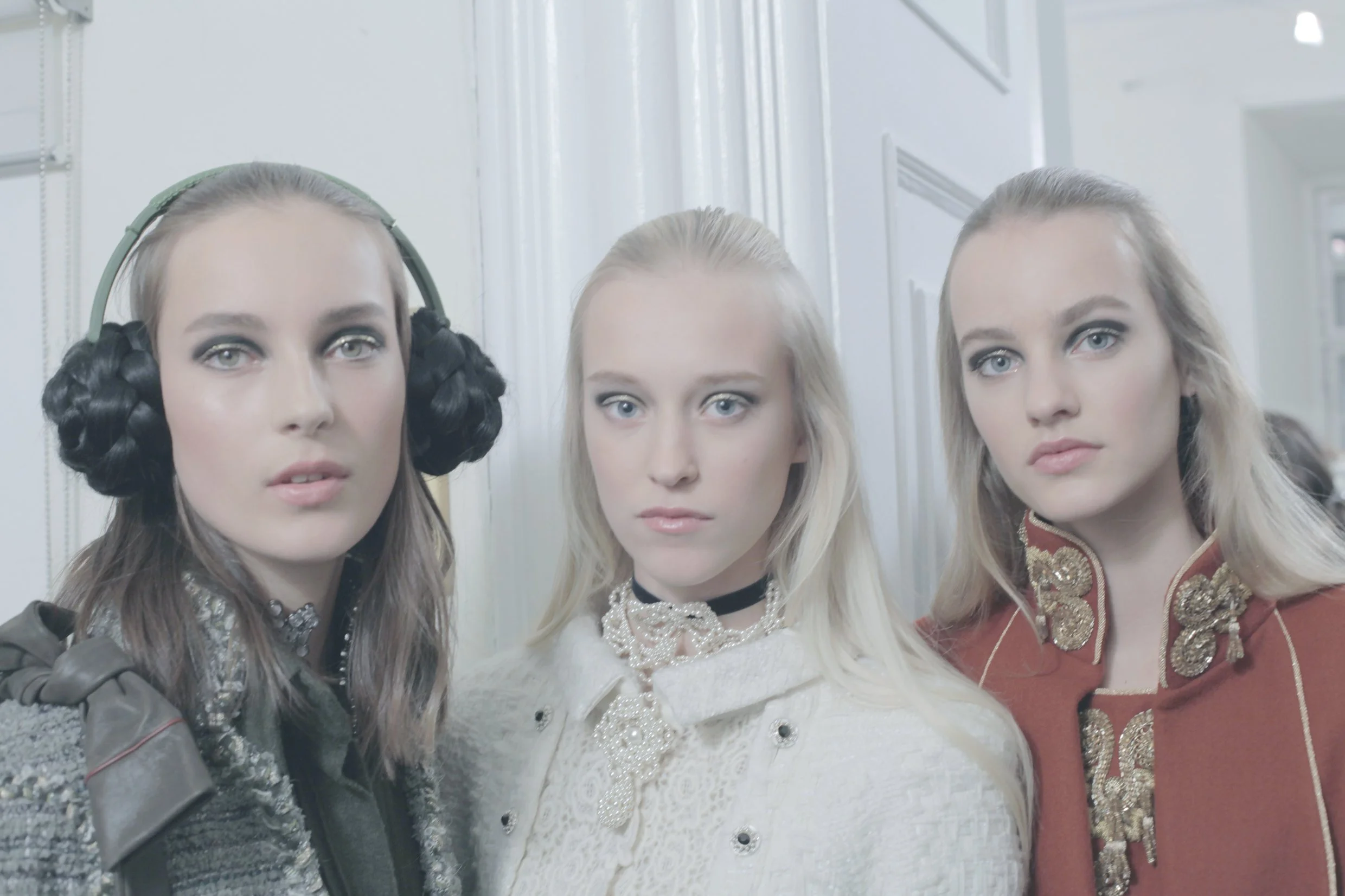 I capelli prendono ispirazione da una principessa Sissi dei giorni nostri (vedi l’ultimo video di Karl Legerfeld Reincarnation in cui Cara Delevingne interpreta proprio la suddetta) che abbina un lusso di fine Ottocento a un glamour anni Settanta senza tralasciare la facilità di realizzazione del nostro secolo. A capo dell’hair team, Sam McKnight si è sbizzarrito anche questa volta raccogliendo i capelli in mezze code vaporose (realizzate con l’aiuto di un ferro Babyliss e dell’ormai noto Dry Texturizing Spray di Oribe) impreziosite talvolta da preziosi fermagli o fiocchi di satin, e altre da headphones (cuffie) del tutto particolari. Soprannominati da McKnight “braidphones”, questi accessori sono stati realizzati con capelli veri - biondi, castani e rosa - e interpretano in chiave moderna la tradizione delle trecce Germanic-Style facendole diventare veri e propri must-have per l’inverno.