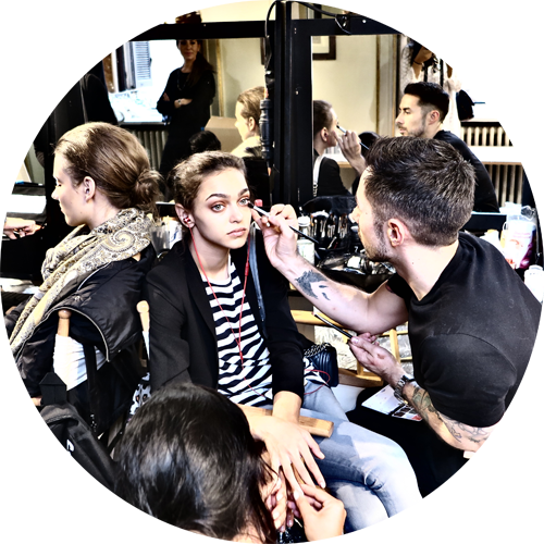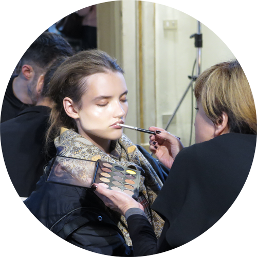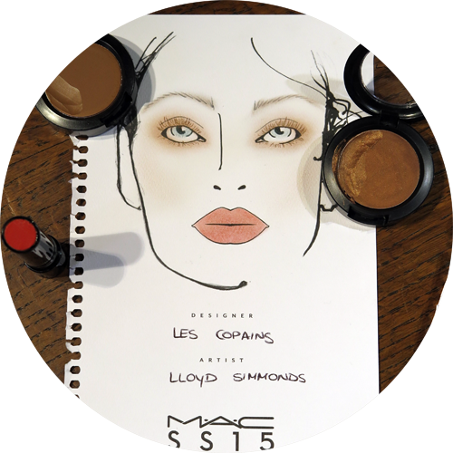 Backstage at Les Copains everything was about a beautiful, glowy, polished skin. Lloyd Simmonds for Mac Cosmetics created something very natural yet precious putting the focus on subtle bronzed eyes and cheekbones and a red-orangey lip.