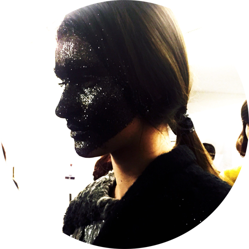 A chiudere lo show, le vedove di Claudio Cotugno, donne Siciliane che celano il loro dolore dietro velette glitterate di make-up. Un look d’impatto studiato dallo stilista e Magnani che nel backstage ha dato vita a un mondo glamour fatto di visi letteralmente soffiati di glitter nero e di tre maschere di paillettes create ad hoc per lo show. Un risultato entusiasmante per un procedimento complicato che ha però dato la possibilità allo stilista e ai makeup artists di sperimentare e di esprimersi. Tenendo fede al mood funereo i capelli sono stati raccolti in una coda polverosa, chiusa da una fascia laccata di nero.