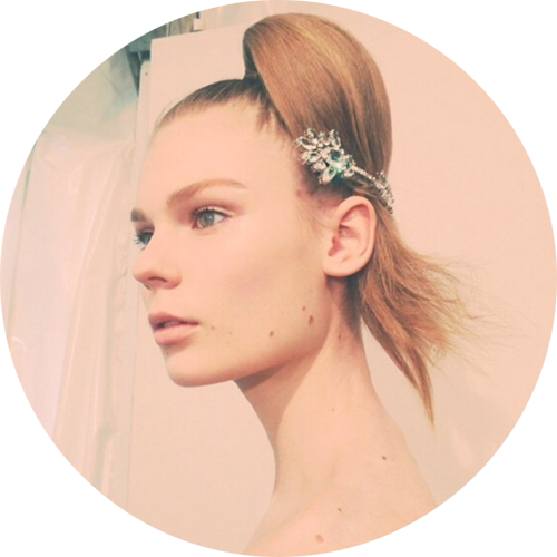 Guido Palau, a capo del team haistyle, ha poi dato vita ad un’acconciatura sorpendente. Dopo aver trattato i capelli con Stay High di Redken per conferirgli un buon grip, li ha raccolti in una coda alta e tesa al centro della testa. Dopo aver nascosto l’elastico con una ciocca di capelli arrotolata intorno allo stesso ha portato le lunghezze di lato e le ha fermate con delle barrette scintillanti e floreali che richiamavano gli accessori portati in passerella.