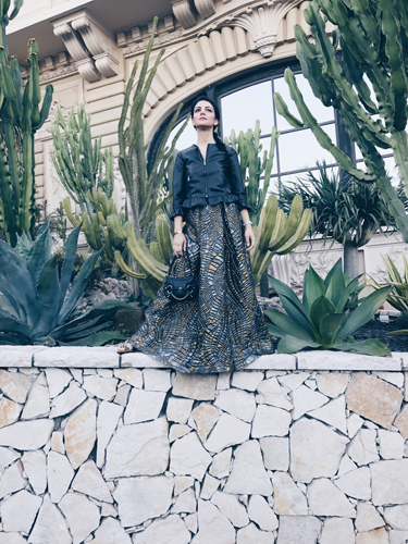 Wearing Zara Jacket, Alberta Ferretti skirt, Christian Louboutin flat sandals and a vintage Gucci bag.