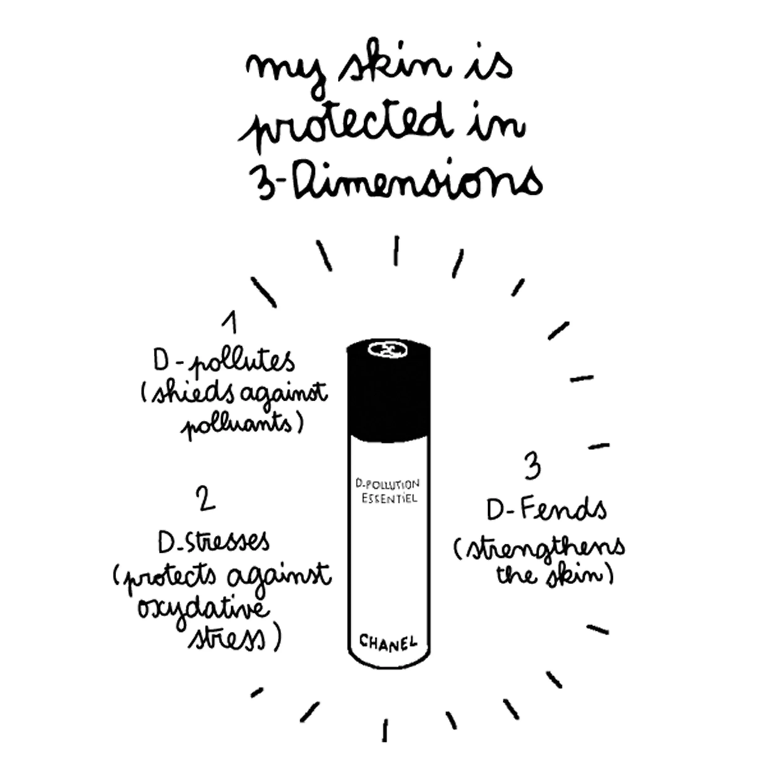 Just a spray is enough to protect skin from urban aggressions. With D-Pollution Essentiel, Chanel gives life to a global anti-pollution gesture that, thanks to the ultra-thin texture in brume and the effortless application, offers a defense system in three dimensions (3D) that: