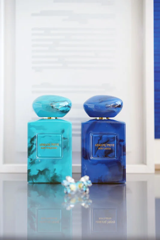 Armani Privé celebrates the power of blue adding two new unisex fragrances to its Haute Couture collection Terres Précieuses: Bleu Lazuli and Bleu Turquoise.