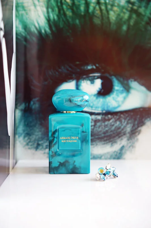 Bleu Turquoise (realizzato da Aurélien Guichard) è il profumo più liquido dei due, penetra nella pelle in un istante impregnandola con il suo dolce accordo minerale. Avete mai sentito parlare di vaniglia salata? Armani Privé Bleu Turquoise è la più bella contraddizione di note olfattive che dà vita a una transizione unica tra accordi minerali salati e una nota avvincente di vaniglia. Basta uno spruzzo di Bleu Turquoise, infatti, perché la mente inizi a viaggiare, e se inizialmente l'impressione è quella del mare, con la mineralità degli accordi salati, e poi quella di una vera esperienza in un mercato indiano tra spezie e incenso, alla fine ciò che rimane sulla pelle è una dolcezza molto spirituale.